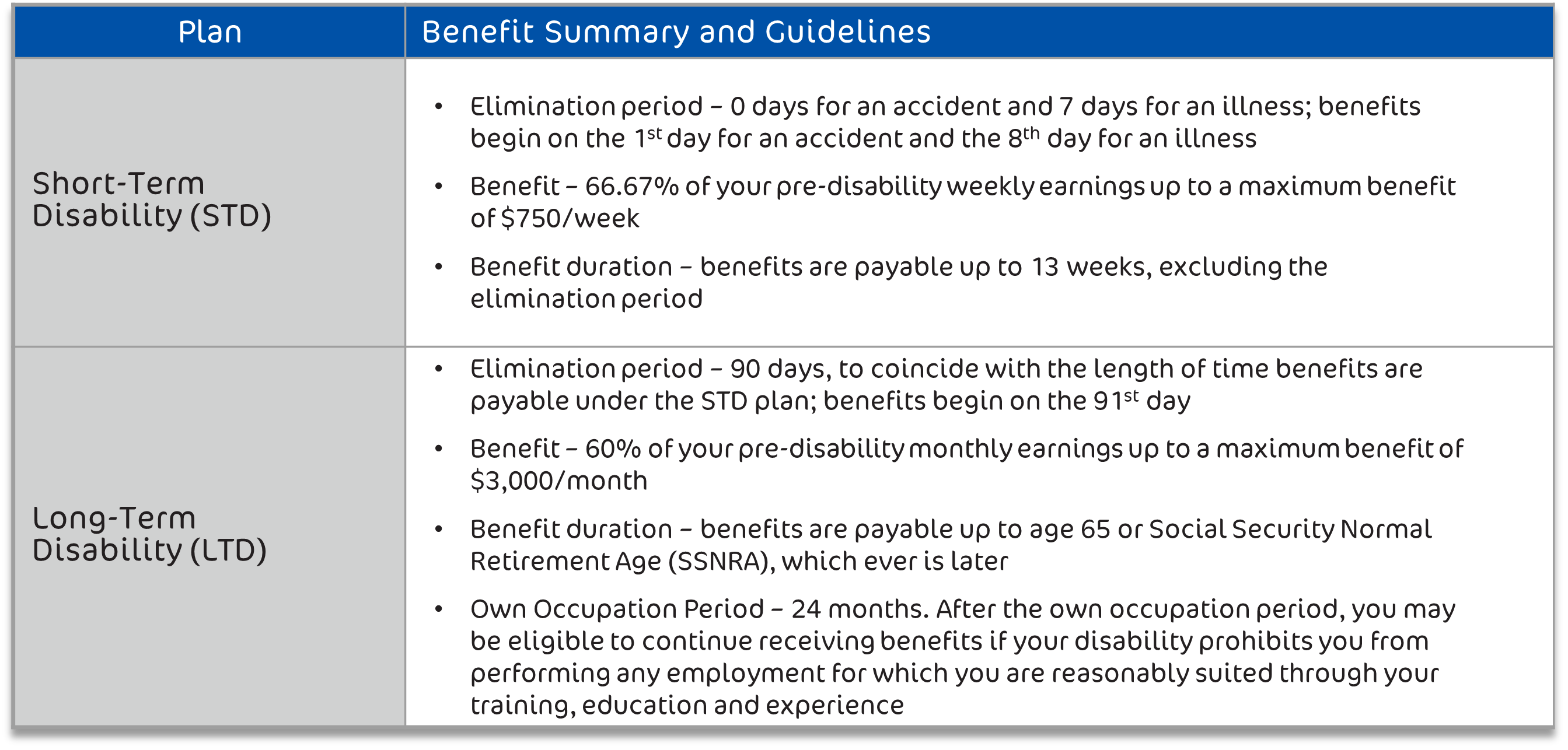 Disability insurance is paycheck protection and replaces a portion of your earned income if you are unable to work, on a full or partial basis, because of a non-work-related injury or illness. Operation Smile pays for employees’ Short-Term Disability and Long-Term Disability coverage. The chart below provides a summary of the coverage.
