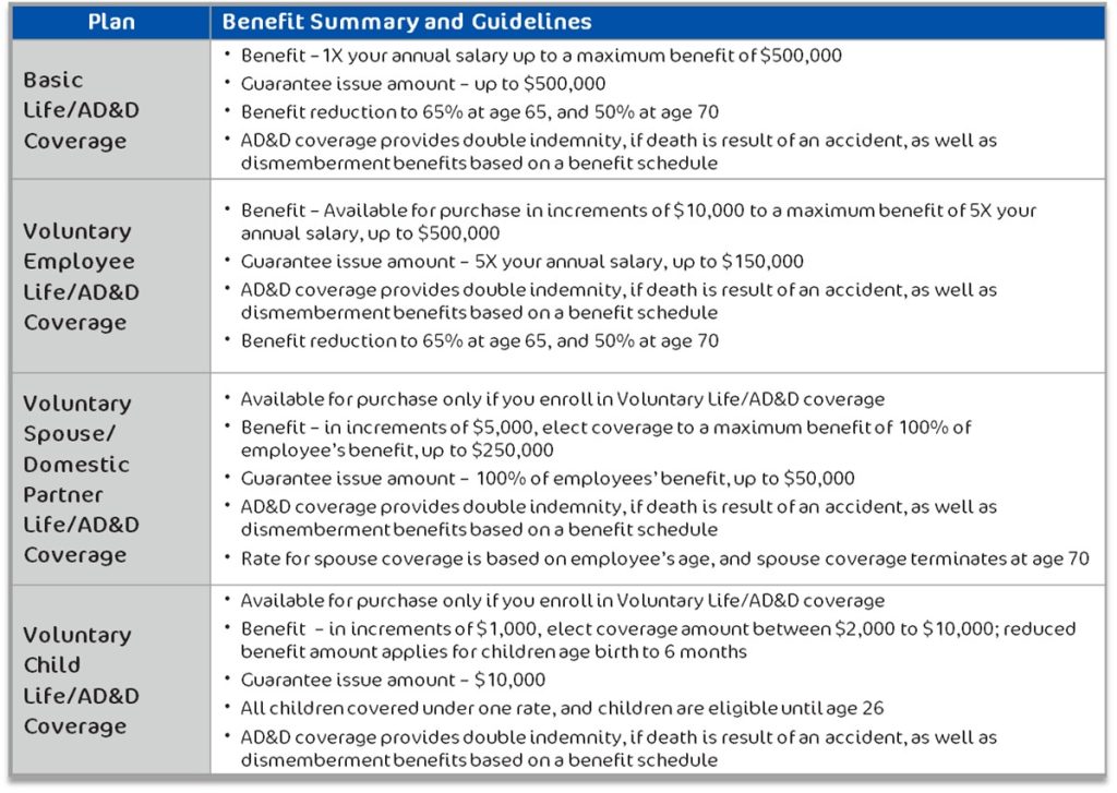 Life and Accidental Death and Dismemberment (AD&D) insurance provides financial protection for loved ones should the insured individual pass away. Operation Smile pays for employees’ Basic Life/AD&D coverage. The chart below provides a summary of the coverage.