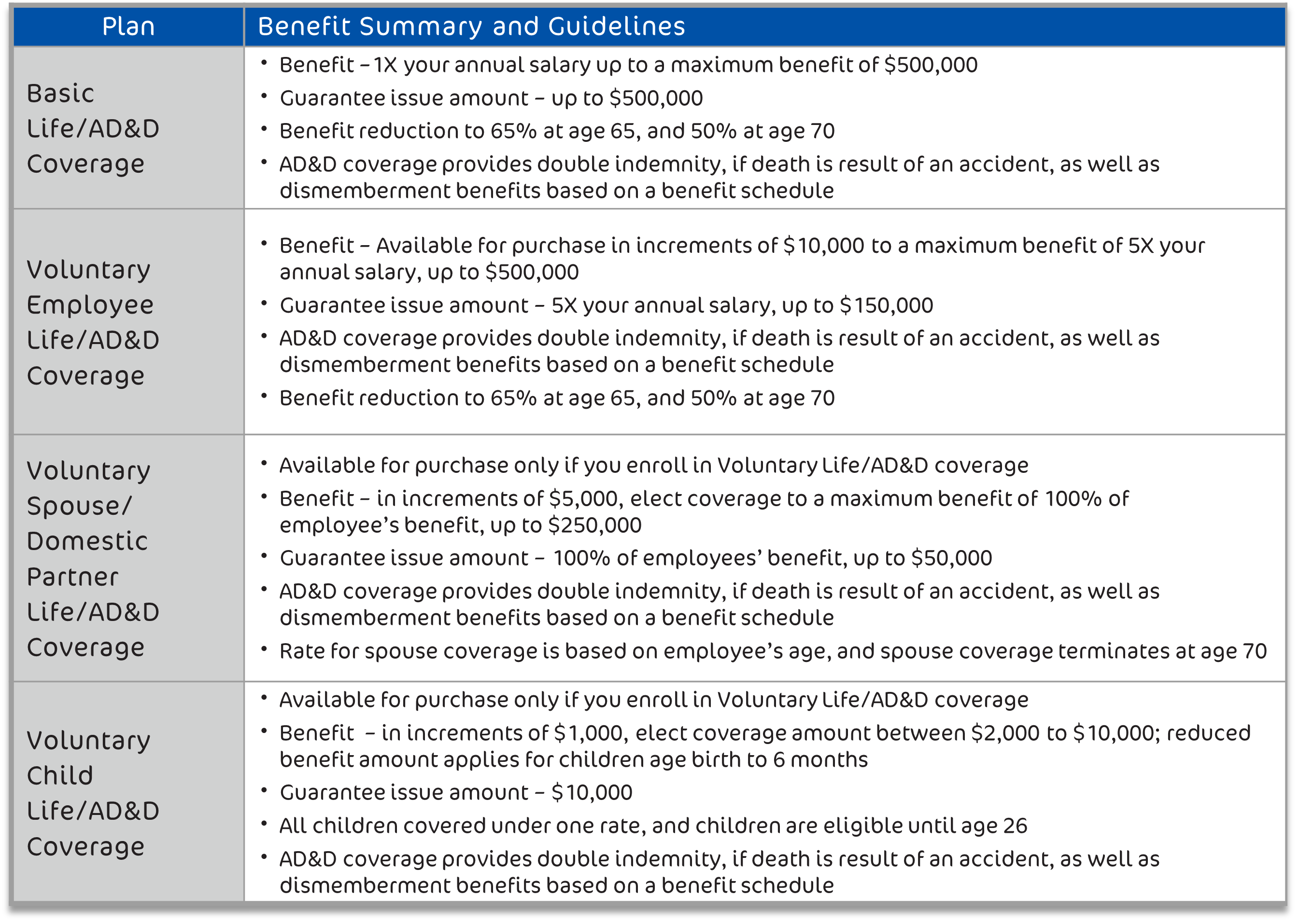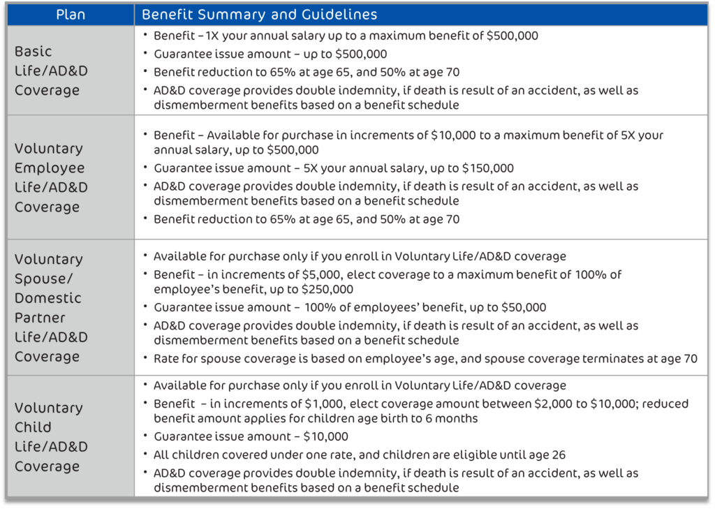 Life and Accidental Death and Dismemberment (AD&D) insurance provides financial protection for loved ones should the insured individual pass away! Operation Smile pays for employees’ Basic Life/AD&D coverage and makes Voluntary Life/AD&D available, at group rates, so employees can purchase coverage for themselves and their dependents. The chart below provides a summary of the coverage.